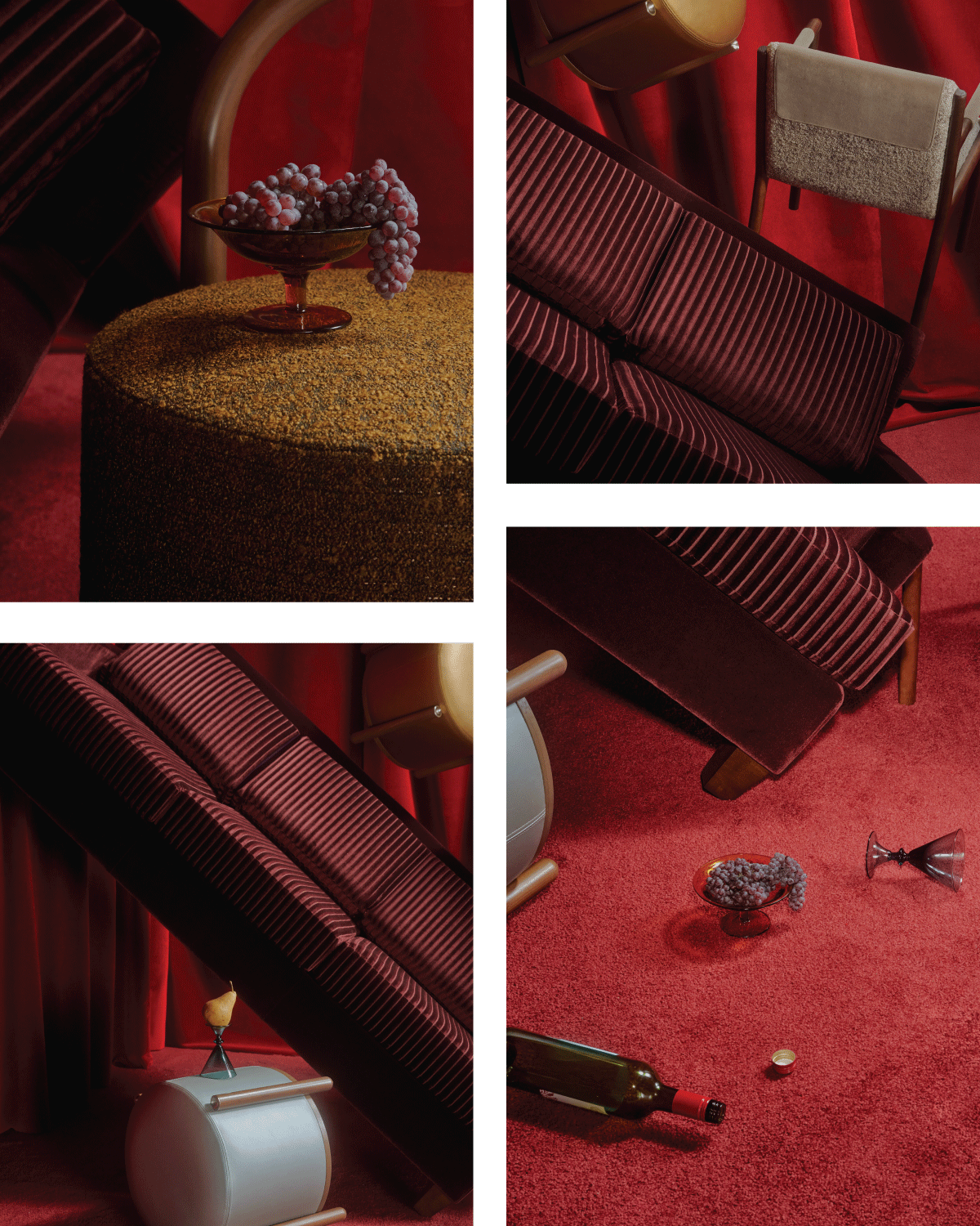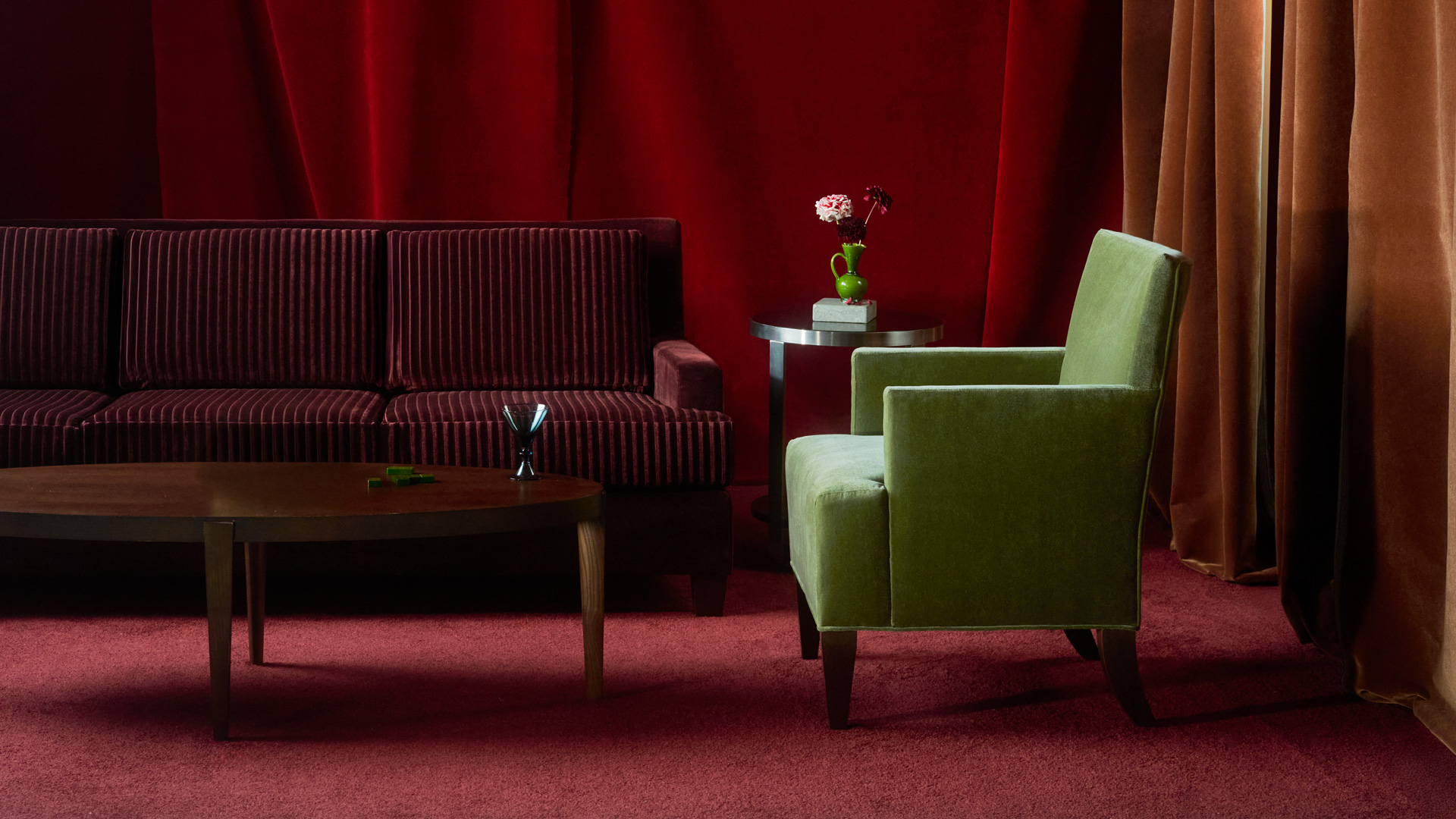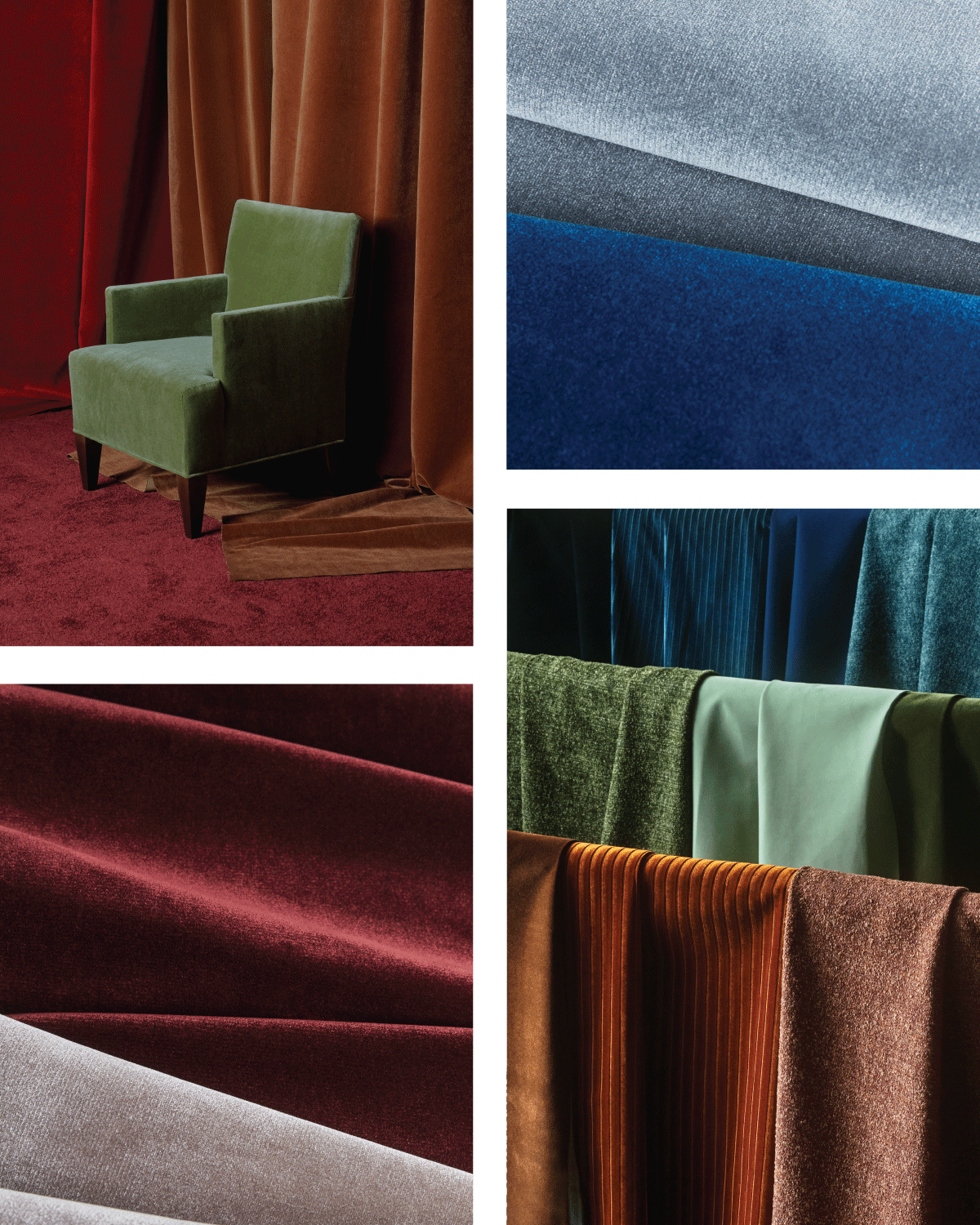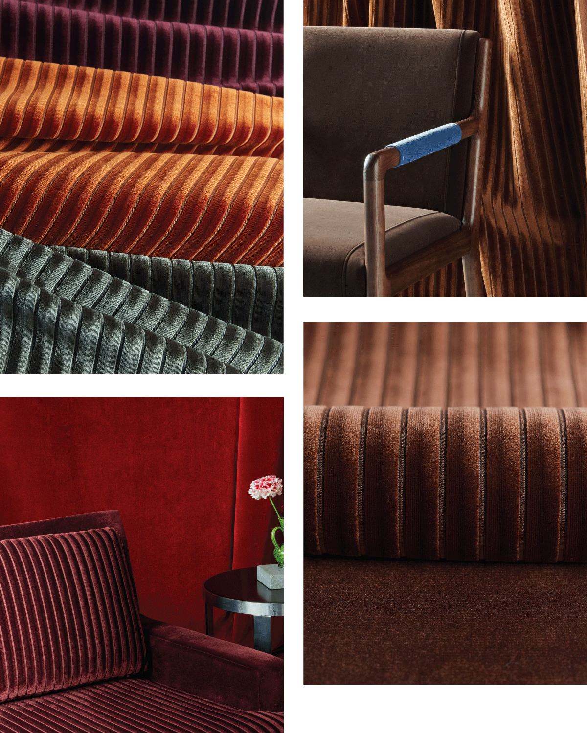 Commanding attention with precise raised ridges in perfect linear formation, Velvet Cord is the collection's protagonist. Each ridge features alternating velvet pile directions that create tonal banding—an additional layer of light play within the structural pattern. Velvet’s natural luster enhances the dimensional effect, transforming flat upholstery into a dynamic surface that changes from moody and intimate to bold and sculptural as lighting conditions change.